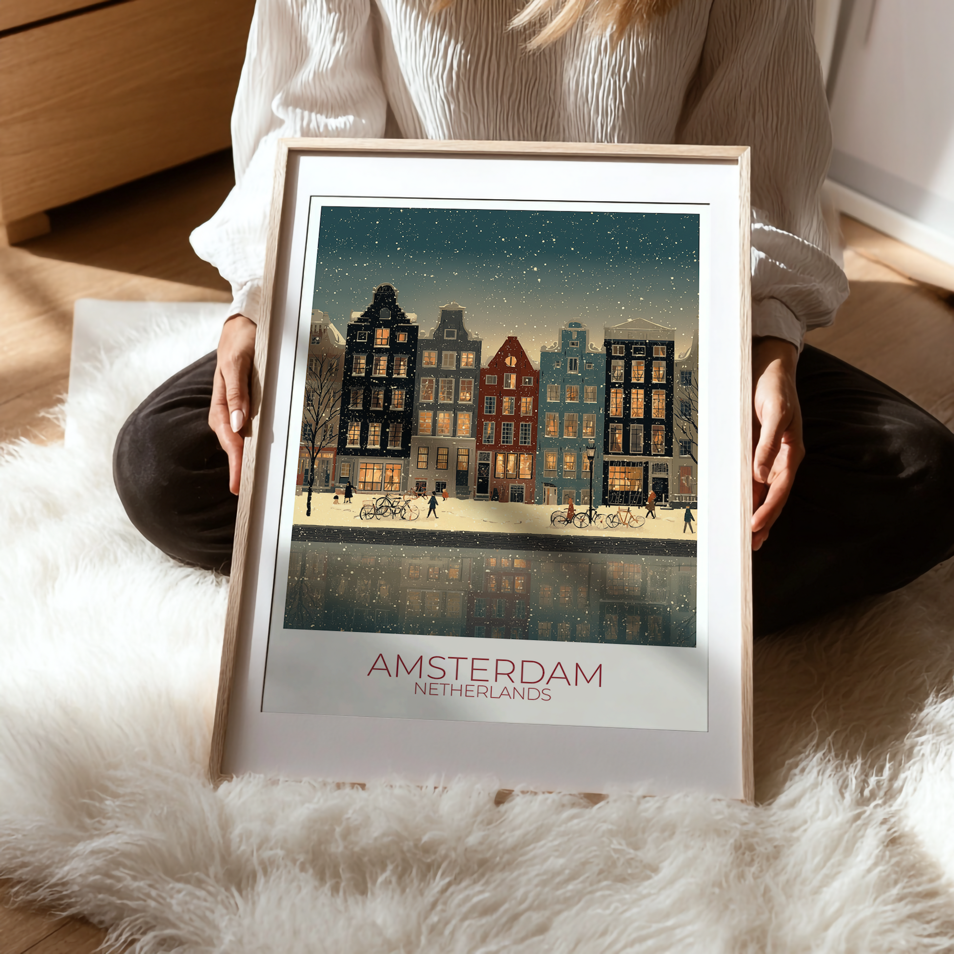Amsterdam Christmas Art Print – Winter Canal Scene, Personalised Dutch Gift, Limited Edition